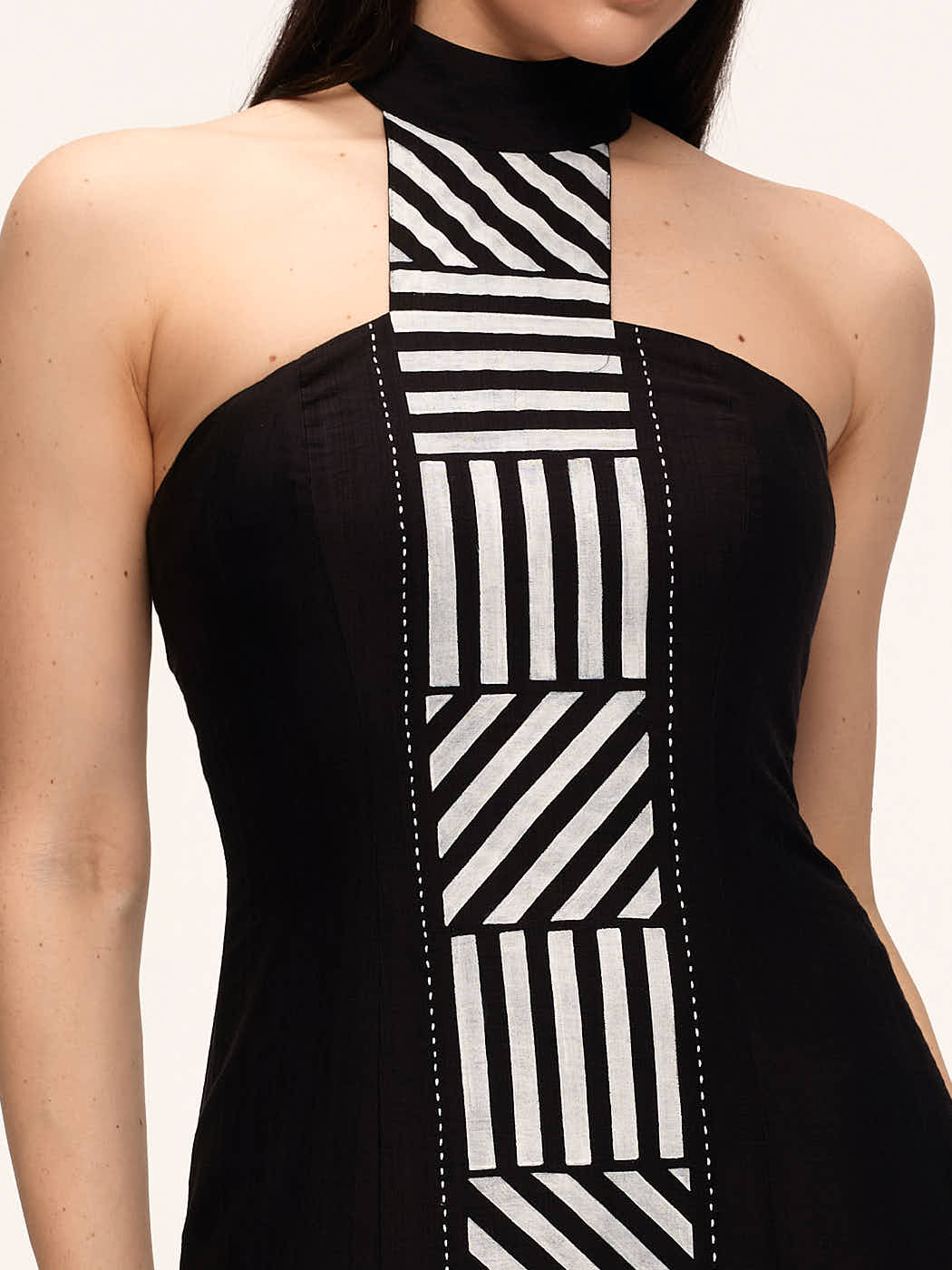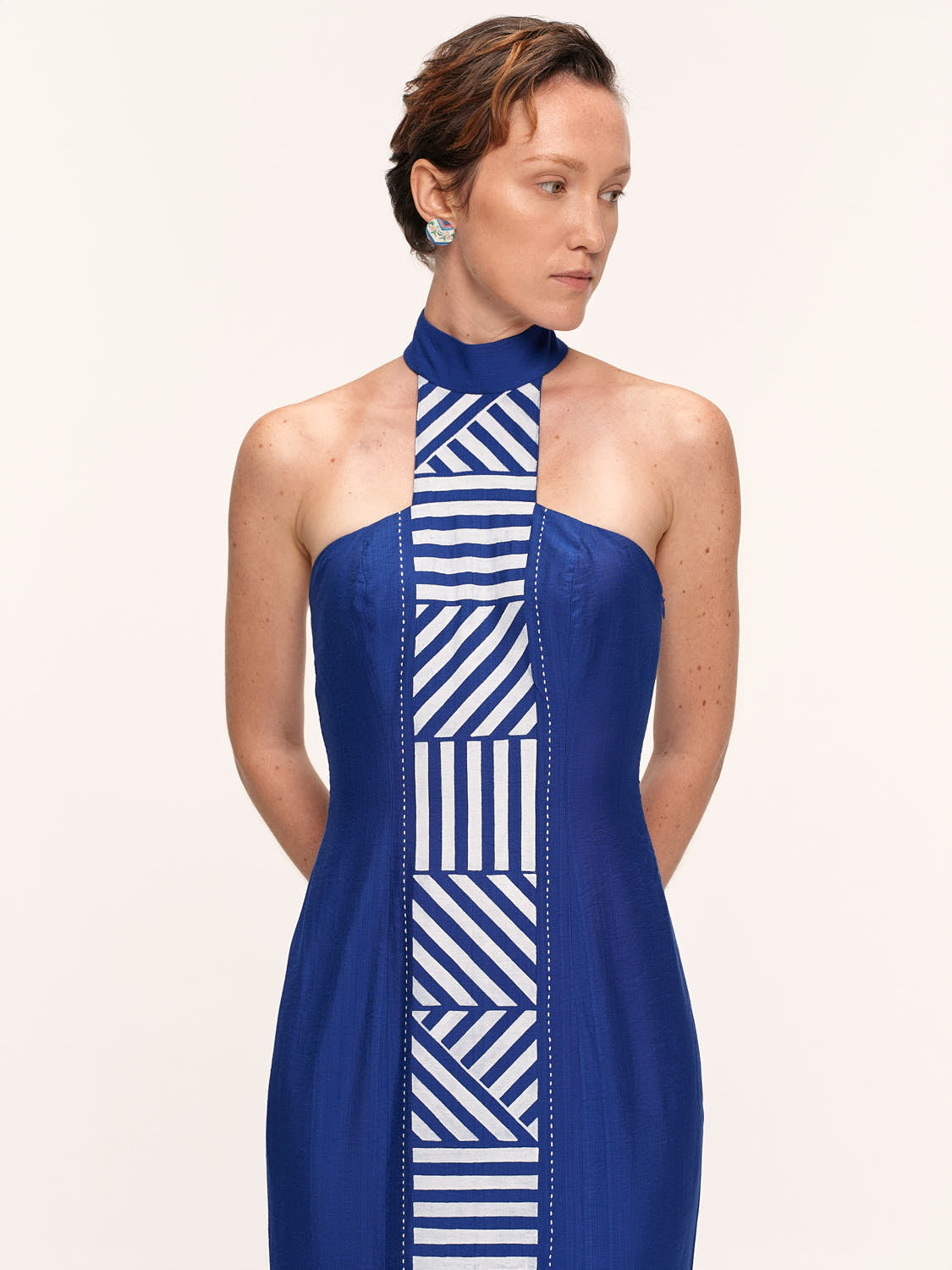 The dress's design is conceived to enhance this central work of art. The halter neckline draws the eye to the shoulders and neck, inviting it to follow the path of the geometries. Crafted from our Dui silk, the dress falls to the floor with an ethereal fluidity, creating a statuesque and unforgettable silhouette that moves with you.
