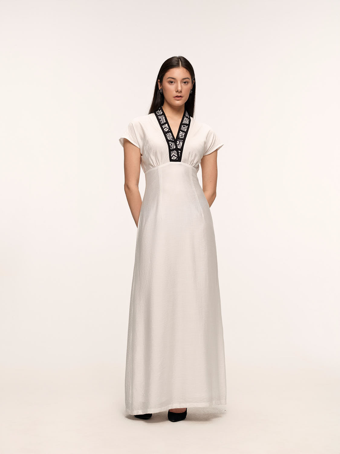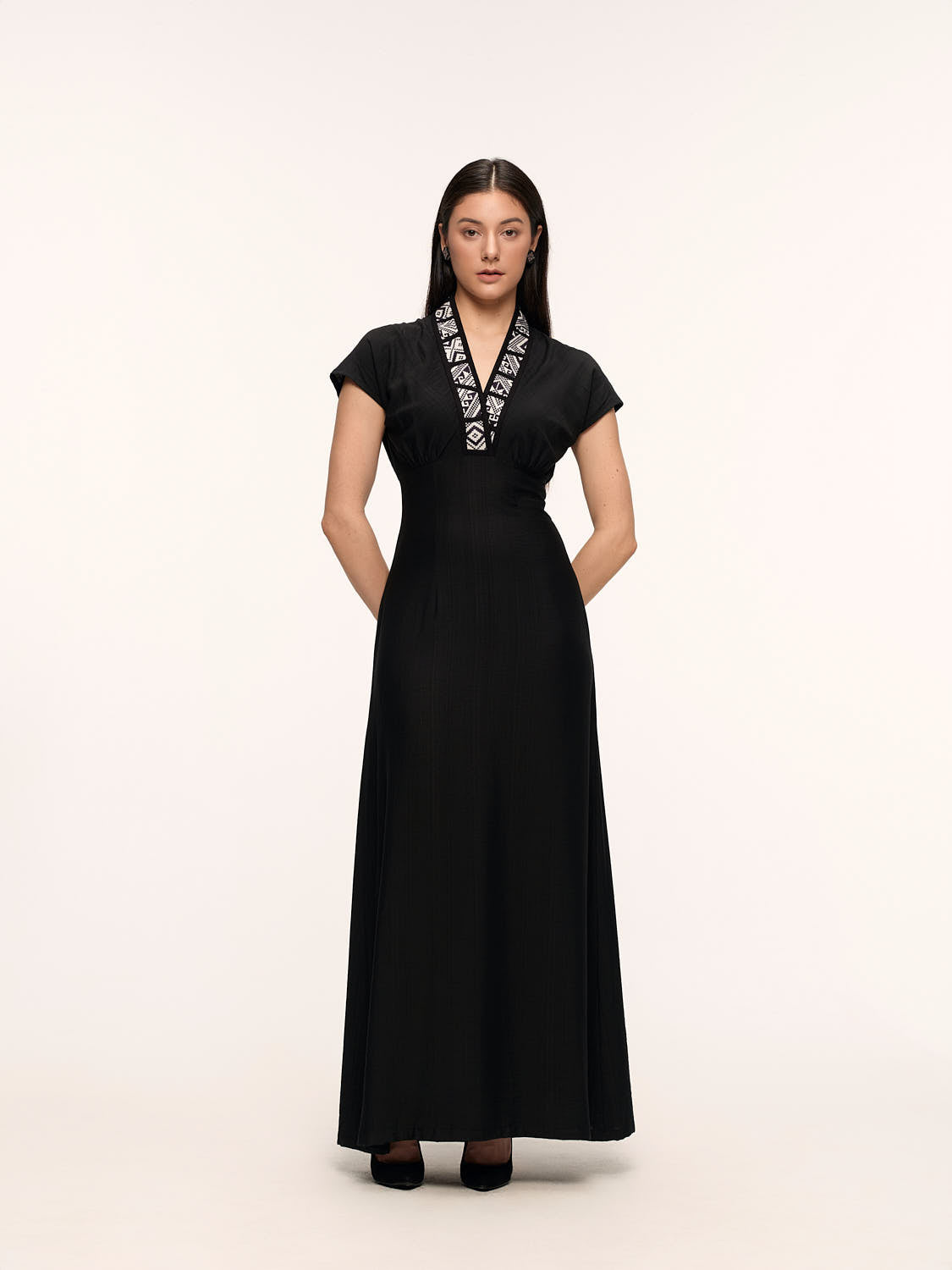 There are jewels that are not made of metal or stone, but of thread and time. This dress wears one of those jewels: a hand-woven ‘necklace’, a piece of cultural heritage that adorns the neckline and gives it a regal soul. It is not a dress, it is a treasure.