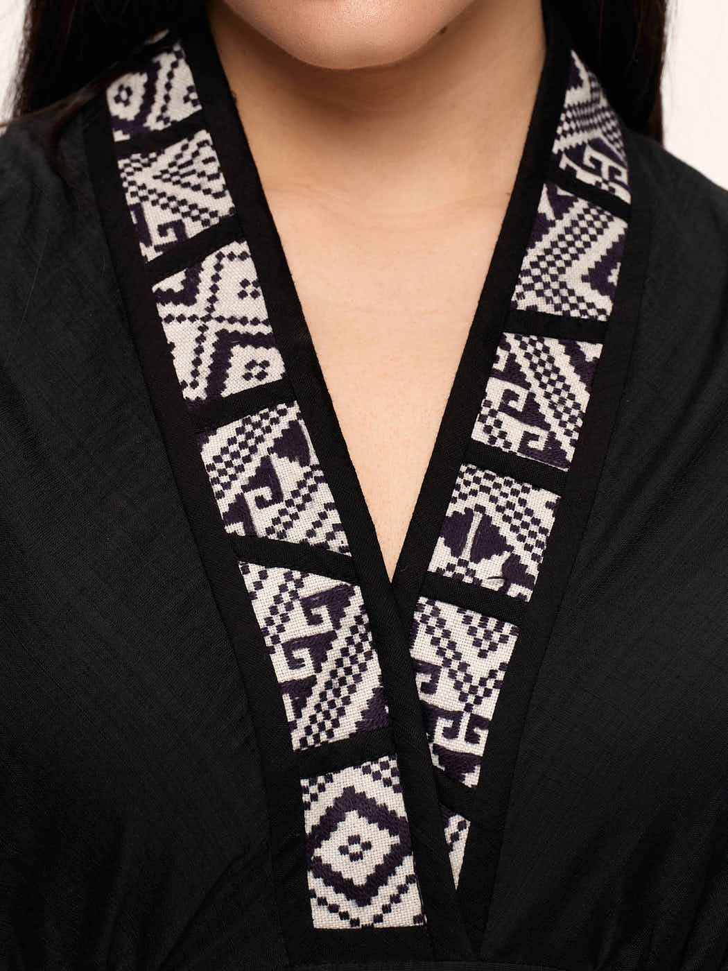 The spectacular ‘necklace’ is actually a brocade fabric created on hand looms by Thai women in the mountains of Vietnam. Using ancestral techniques, they create these complex patterns which, in their culture, are a symbol of beauty and status. Each piece is unique and carries with it the story of the artisan who wove it.