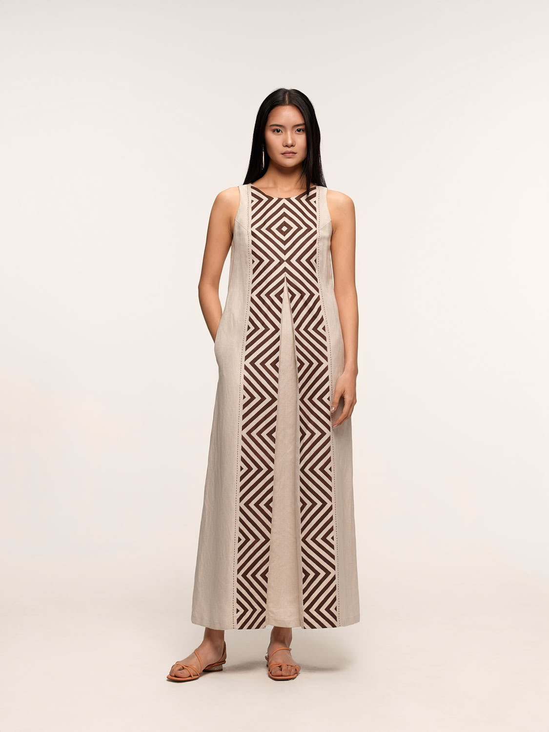 The design is defined by its innovative front panels, which open as you walk, creating a dynamic and striking silhouette. Made from high-quality linen, the dress has the perfect drape and weight to accentuate this effect, flowing with you with every step. It is a piece that comes to life when you move.