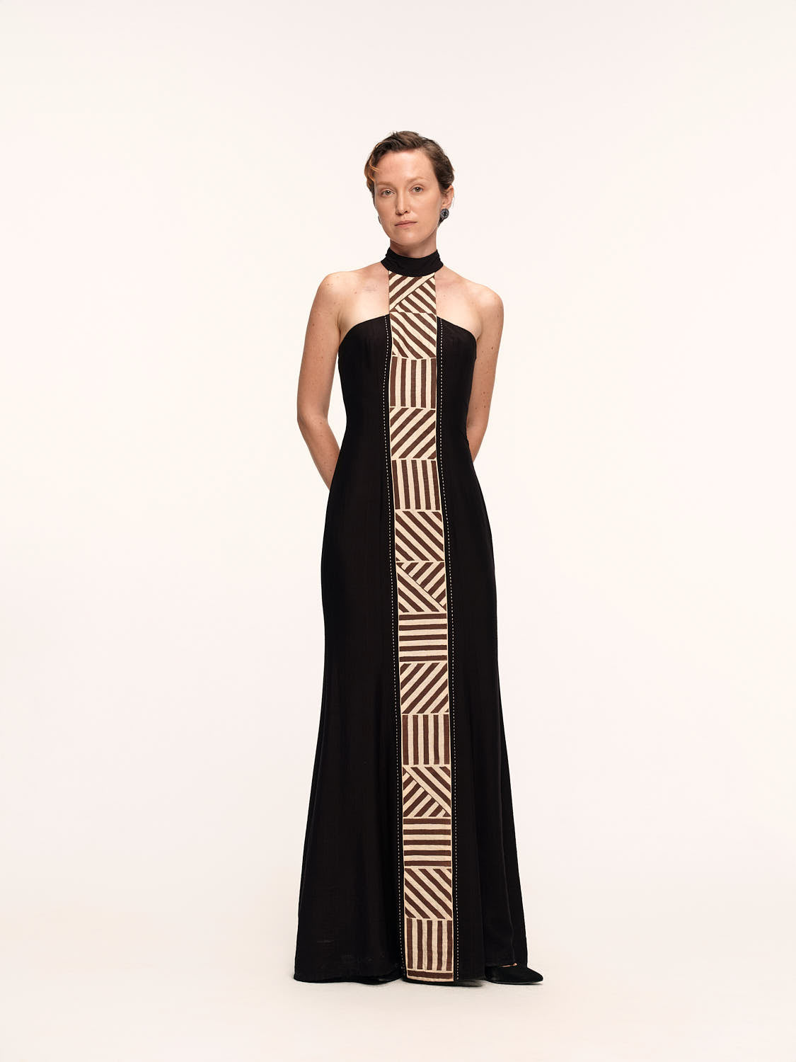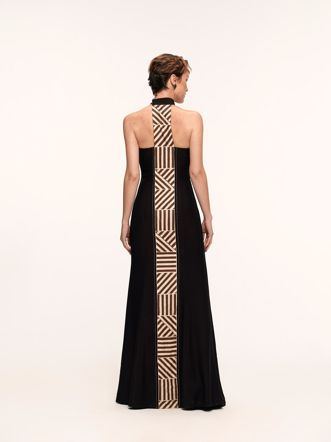 The dress's design is conceived to enhance this central work of art. The halter neckline draws the eye to the shoulders and neck, inviting it to follow the path of the geometries. Crafted from our Dui silk, the dress falls to the floor with an ethereal fluidity, creating a statuesque and unforgettable silhouette that moves with you.